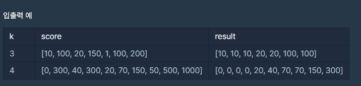 문제해독 : score 배열이 일차가 순차적으로 증가됨에 따라 result배열에는 k의 배열수 까지만 수치가 누적됨