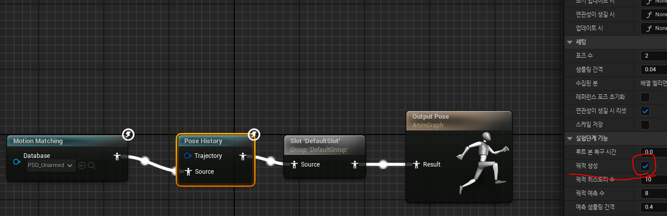애니메이션 블루프린트를 만들고 모션매칭 노드와 포즈 히스토리 노드를 연결후
