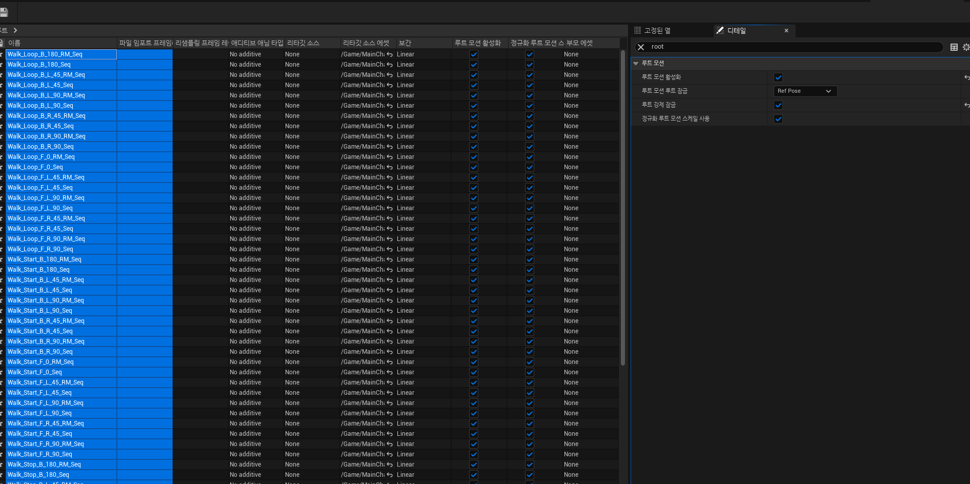 사용할애니메이션의 루트모션 활성화를 해주고 루트를 잠궈줍니다