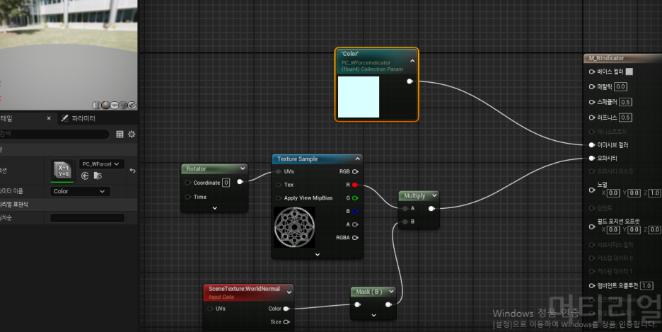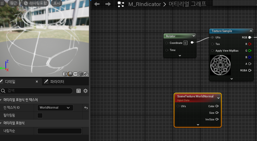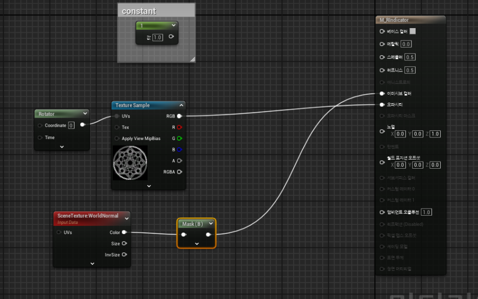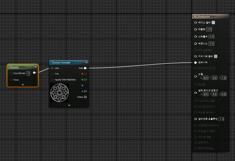 회전을 위해 Rotator 노드를 넣어주고 해당과같이 연결해준다