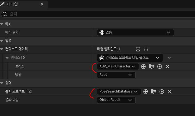 출력오브젝트 타입을 PoseSearchDatabase로 설정해줍니다