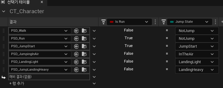 점프 시작(JumpStart), 점프 중(JumpingInAir), 가벼운 착지(LandingLight), 무거운 착지(LandingHeavy) 조건체크함수