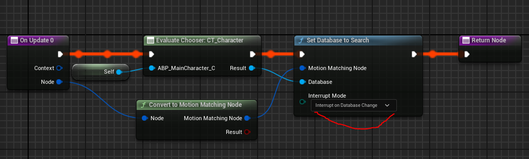 모션매칭의 결과 데이터베이스를 Interrupt on DataBase Change로 변경해주고 해당 노드와 같이