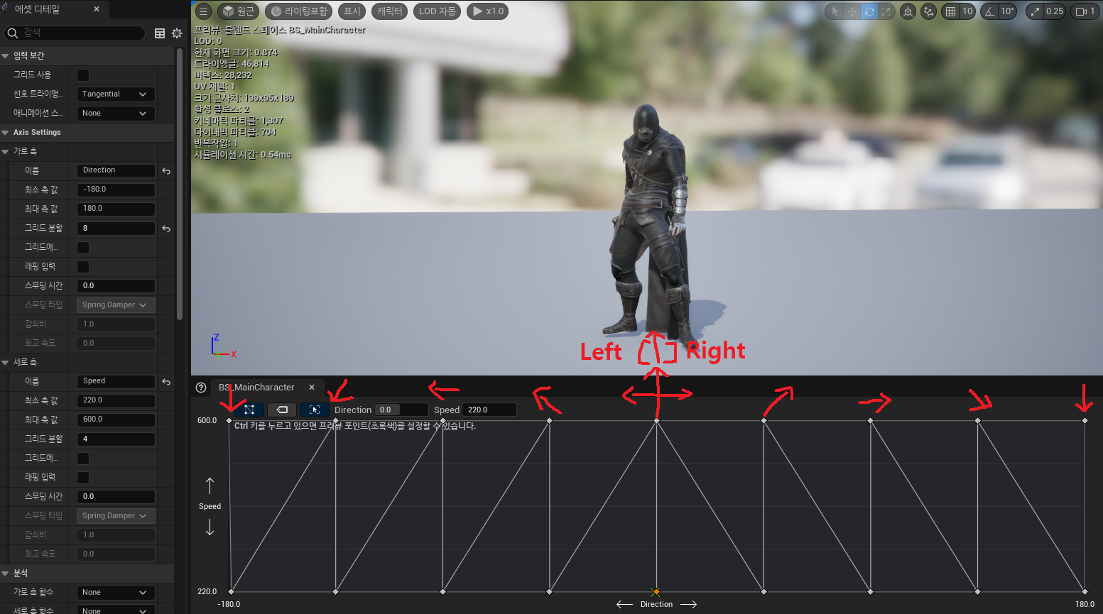 가로축값인 Direction은 캐릭터의 캐릭터가 바라보는 전방 대비 실제 이동 방향을 가져왔습니다