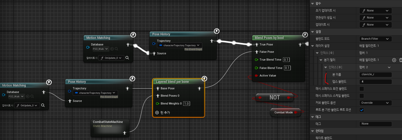 clavicle_r Bone 기준으로 애니메이션을 나누고 토글변수인 CombatMode변수로 Blend Pose 를 결정하였습니다