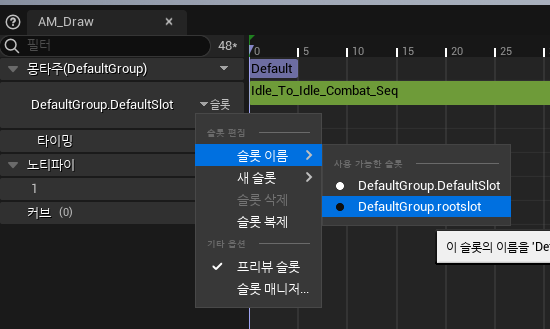 해당 애니메이션 몽타주를 슬롯 이름을 아까 만든 rootslot으로 변경해줍니다