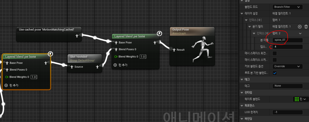 첫번째 Layered blend per bone노드는 spine_01기준 4 입니다