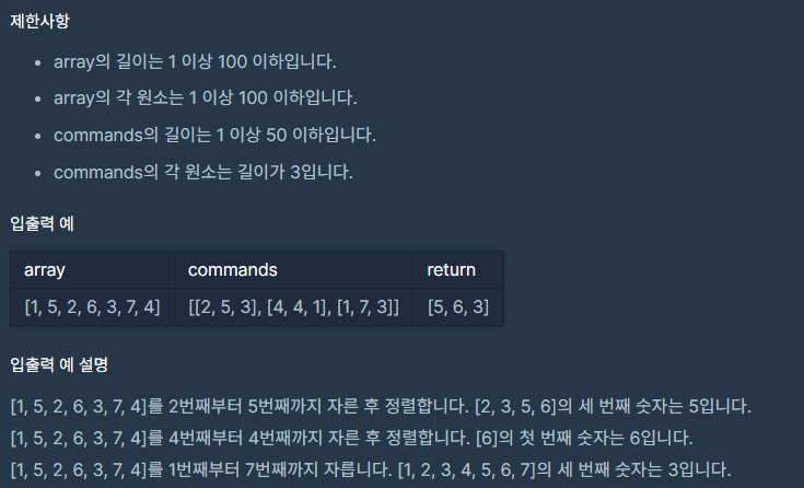 문제해석 : array배열의 2차원배열의 command[0]번부터 command[1]까지 자른뒤