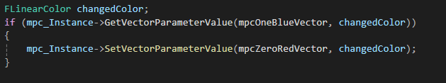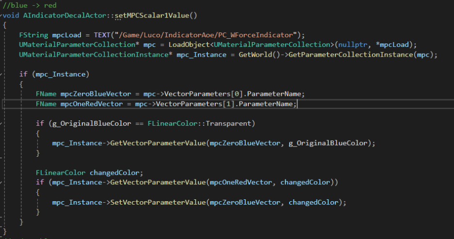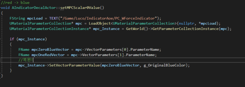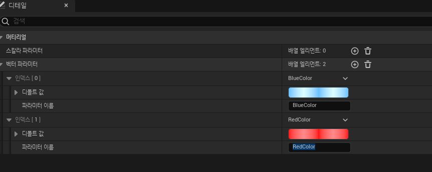 내가 지금 첫번째 파란색벡터일때 ->SetVectorParameterValue로 빨간색으로 바꿔준다는 코드이다