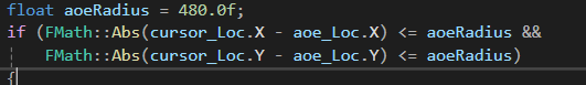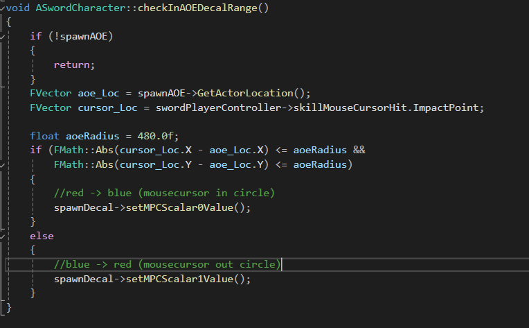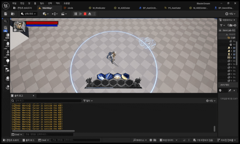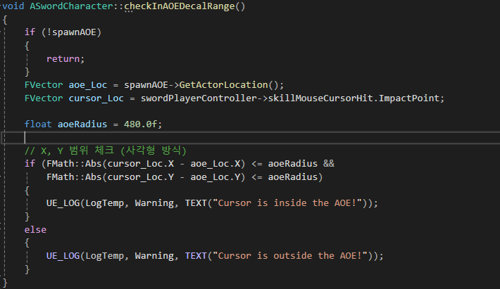 정해둔 aoe크기보다크면Cursor is inside the AOE!로그 작으면 Cursor is outside the AOE!로그를 출력해서