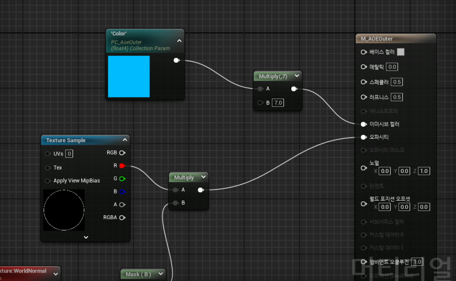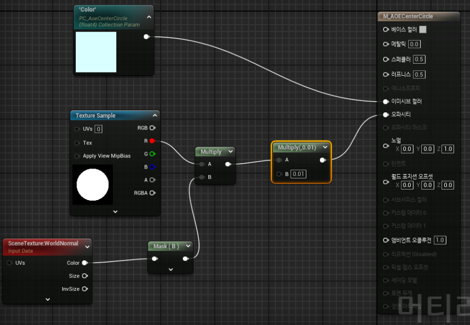 인디케이터원의 색은 미리만들어둔 메테리얼 파라미터 컬렉션의 color값에 따라 바뀌니 원밖으로 나가면