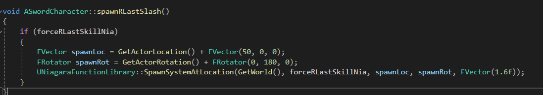 1.6의 크기로 UNiagaraFunctionLibrary에서 SpawnSystemAtLocation으로 나이아가라 스폰을 해주었다