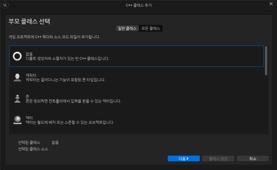 부모클래스를 없음 으로 선택하고 c++클래스를 제작해줍니다