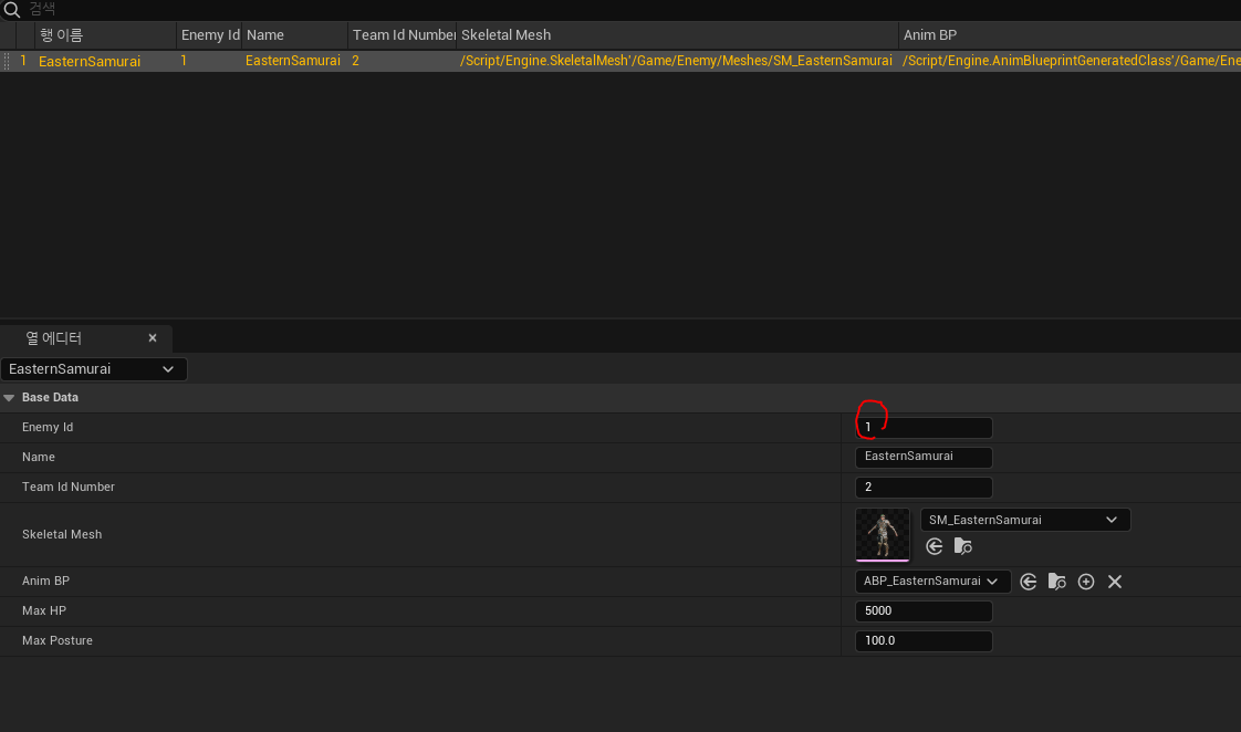 해당 구조체로 데이터테이블을 만들어 EnemyId를 1