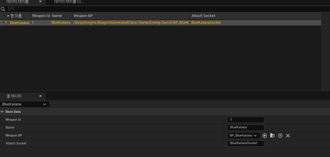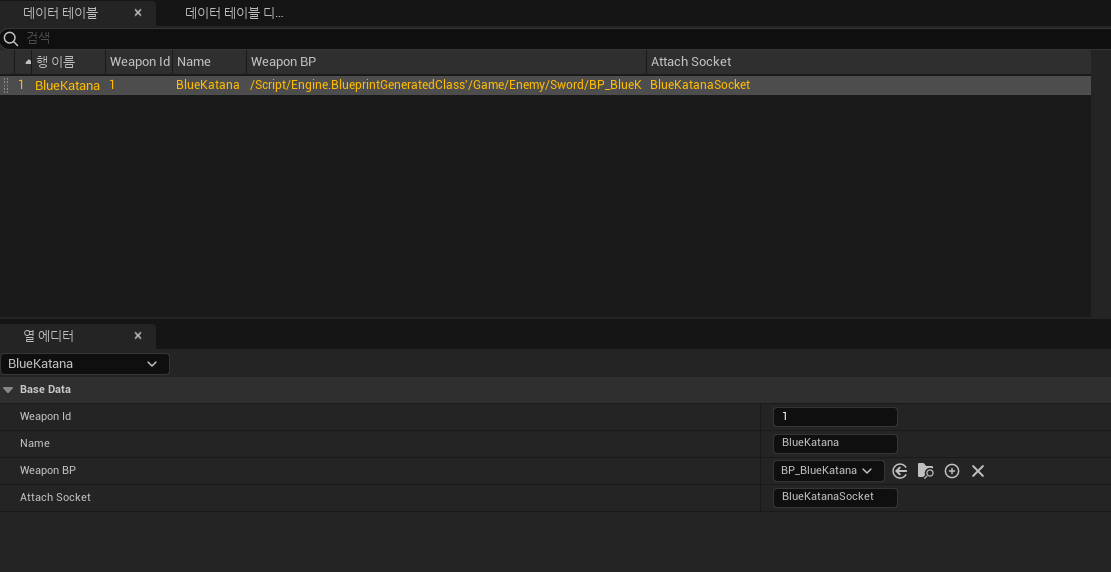 또한 무기를 담당할 데이터테이블또한 만들어주었습니다