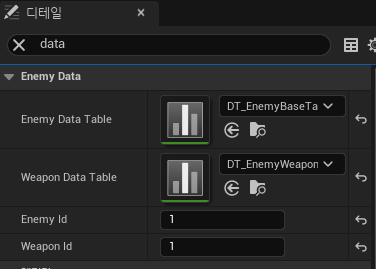 캐릭터 uproperty에서의 enemyId와 WeaponId를 데이터테이블에 존재하는 원하는 id 숫자로 입력해줍니다