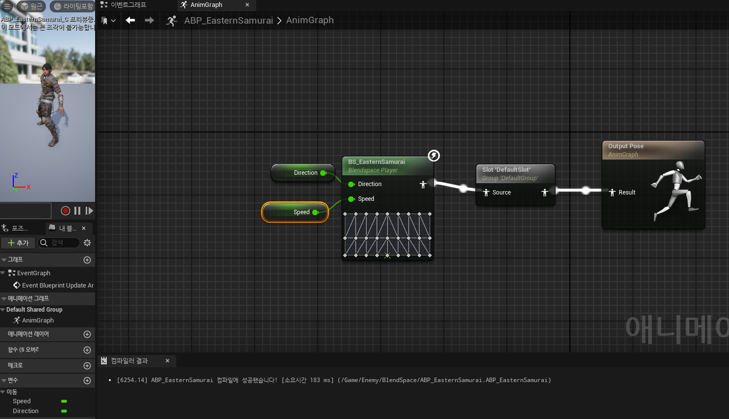 애니메이션 블루프린트는 캐릭터의 speed와 방향을 구하는 공식을 사용하였습니다