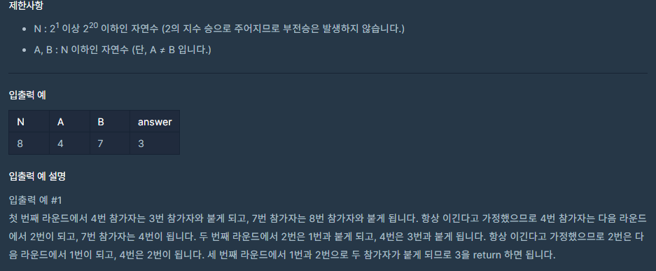 a == b 가 될때까지 a의숫자와 b의 숫자를 (번호 + 1) / 2로 업데이트