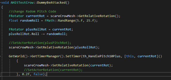 코드는 randomPitch에서 Roll로 변경되었고 getactorlocation 에서 메시의 relativerotation기준으로 변경되었다
