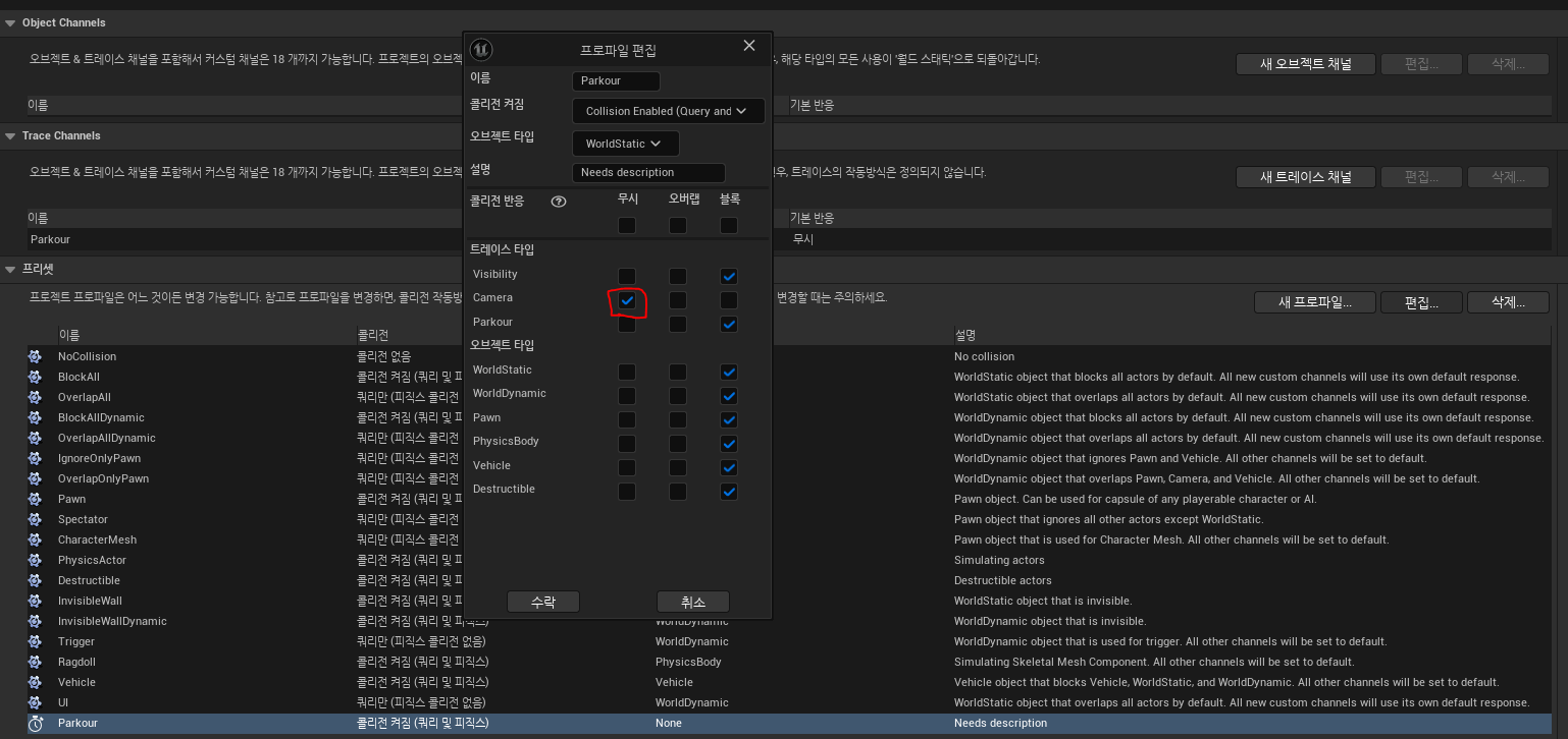 먼저 볼팅을 하며 플레이어가 물체를 넘어갈것이기때문에 파쿠르 프리셋을 적용할 물체의 콜리전 프리셋을