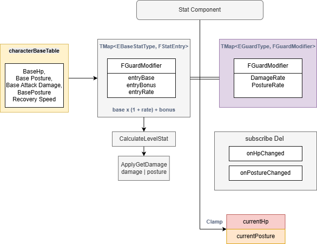 StatComponent는 TMap 기반의 스탯 저장 구조와