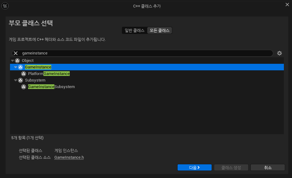 GameInstance를 상속받아서 새로운 c++클래스를 만들어주자