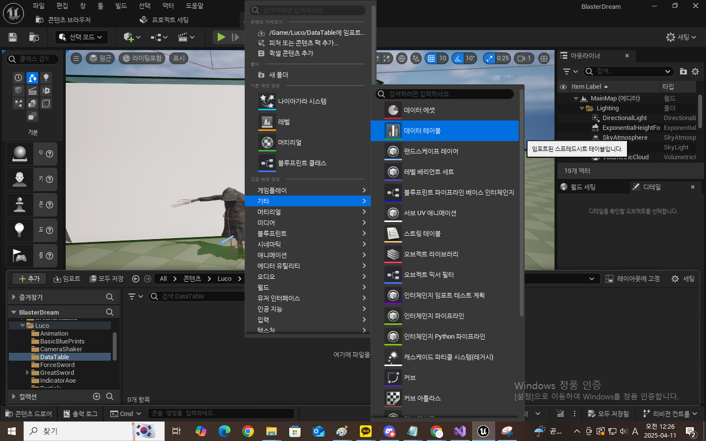 데이터테이블을 사용하기위한 게임인스턴스르 만들어줍니다