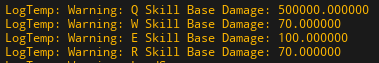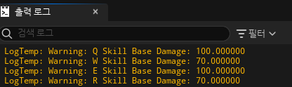각각 데이터테이블에있는 스킬이나 평타의 기본계수 + 랜덤값 randrage(5, 20)값이 출력됩니다