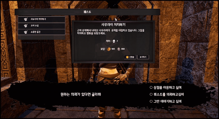 quest.questDescription = LOCTEXT("Quest_KillSamurai_Description", "사무라이 3명을 처치하세요!");