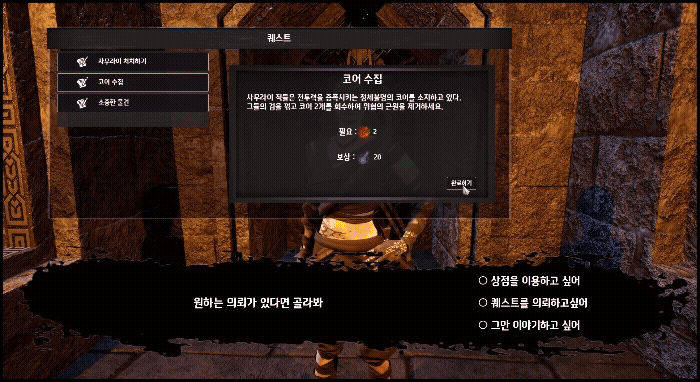 | ShopQuestWidget(위젯) | NPC(의뢰인)과 상호작용할 때 표시되는 퀘스트 UI |