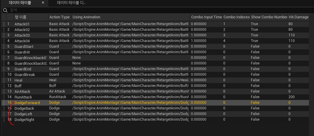 캐릭터의 애니메이션을 담당하는 데이터테이블에 Dodge 타입으로 애니메이션을 추가해주었습니다