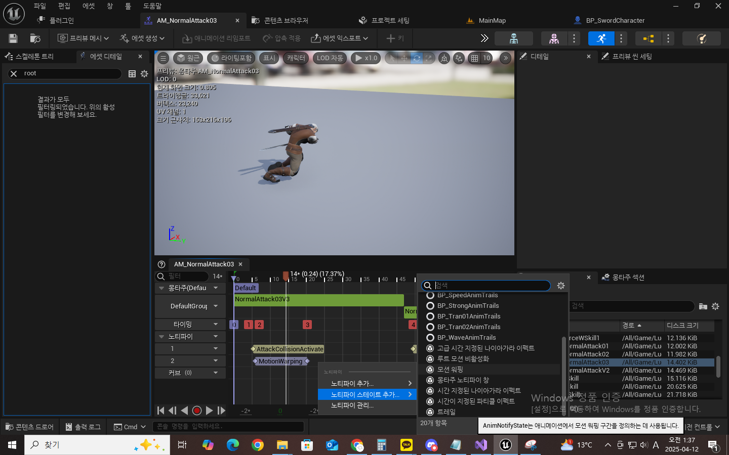 편집 > 플러그인 > Motion Warping 설치후 엔진 재시작