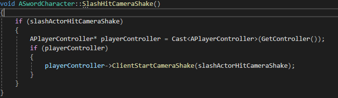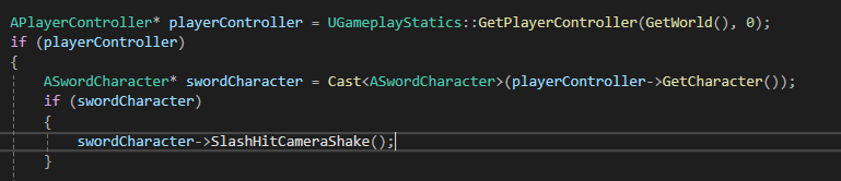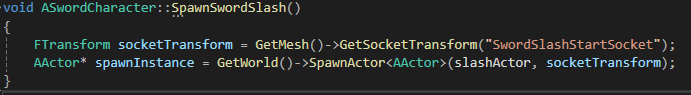 GetSocketTransform함수로 SwordSlashStartSocket의 위치를 얻은다음 SpawnActor로 검기액터 인스턴스를 스폰시킵니다