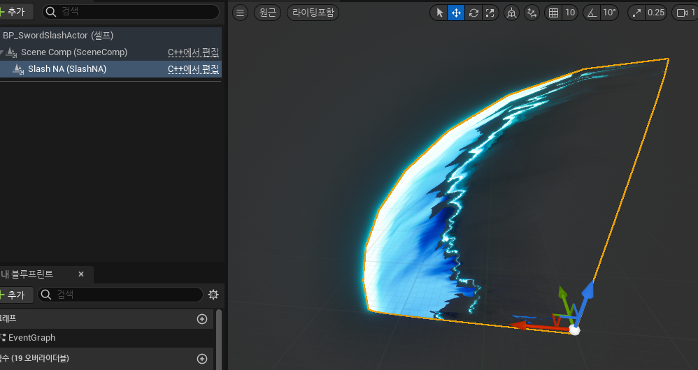 그럼 이제 이 검격 액터와 오버랩할 콜리전박스를 만들어주고 오버랩 처리를 해주겠습니다
