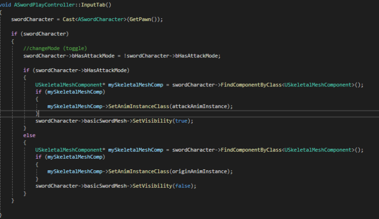 bHasAttackMode가 True일때 칼이 보이고 attackAnimInstance를 들고있고