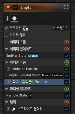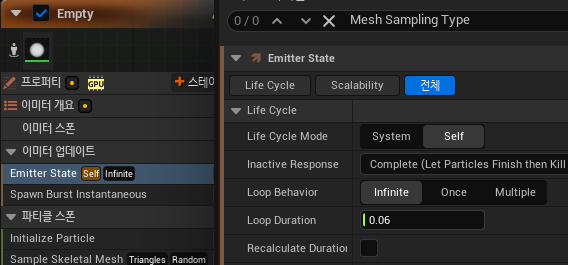 Emitter State에서의 Loop Duration 값을 0.06로 낮춰 스폰주기를 변동하였습니다