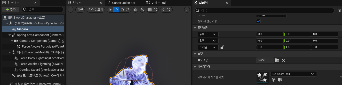 생성자에서 나이아가라 컴포넌트를 생성후 ConstructorHelpers로 아까만든 NA_GhostTrail를 컨퍼런스 복사해서