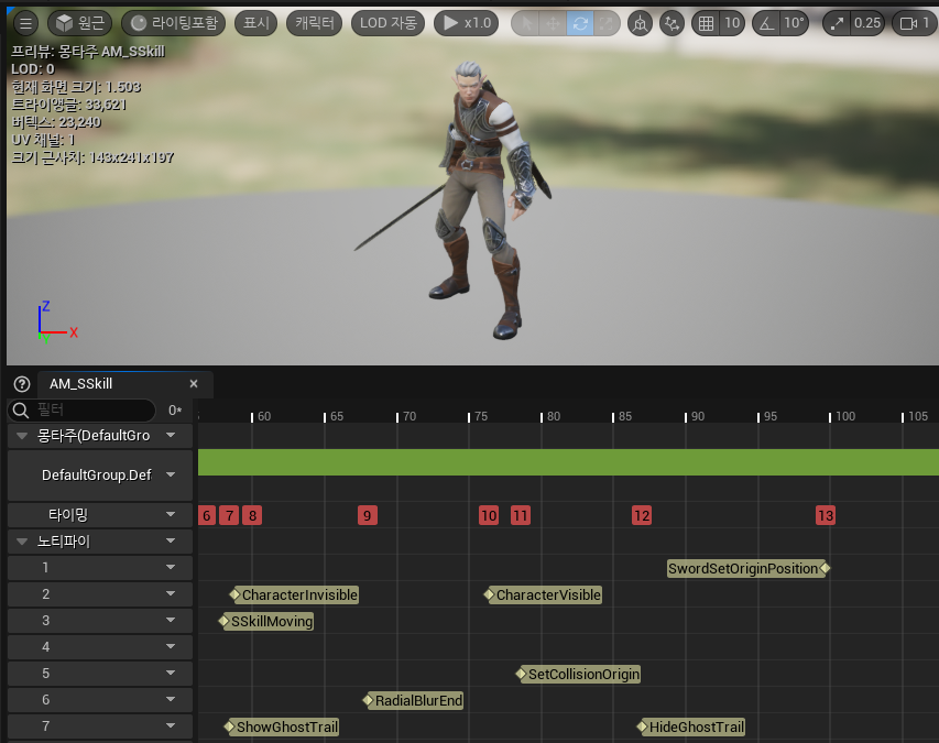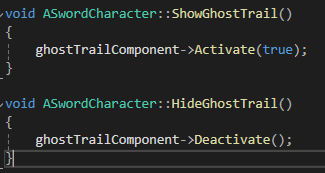 게임인스턴스에서 고스트트레일 컴포넌트를 Active / Deactivate 설정을 해주는 노티파이함수를 만들어줬습니다