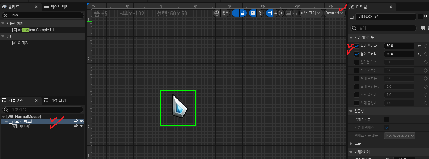 위젯블루프린트에 SizeBox(크기박스)를 넣고