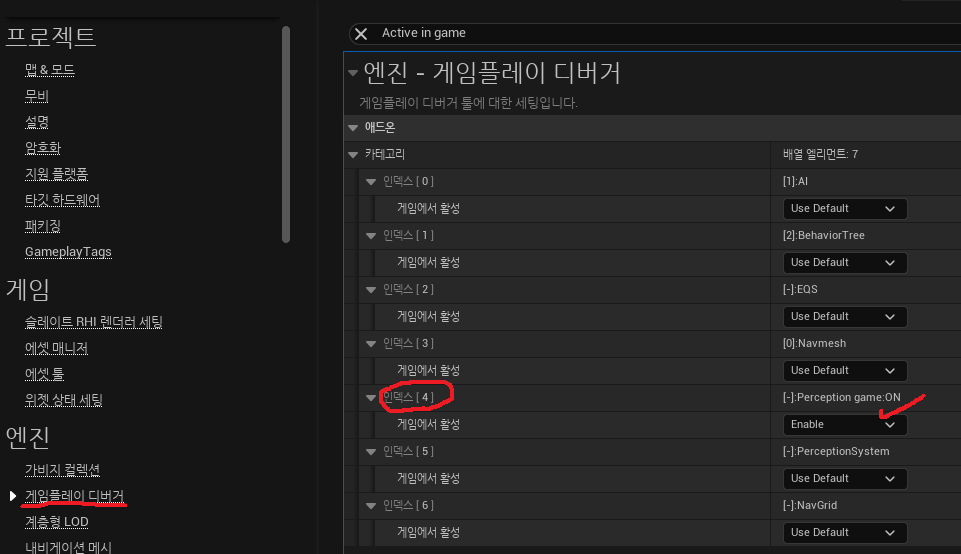 프로젝트세팅 -> 게임플레이 디버거 -> Active In Game -> 인덱스4번에 있는 Perception Game:On을 Enable 로변경