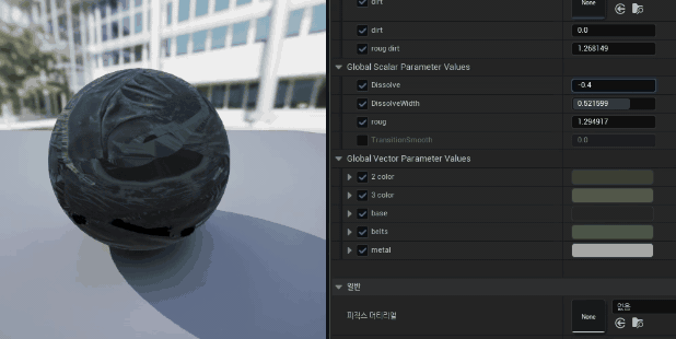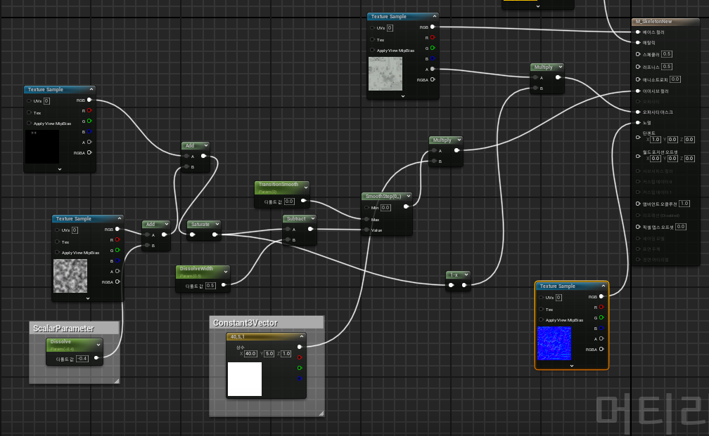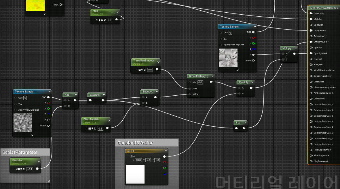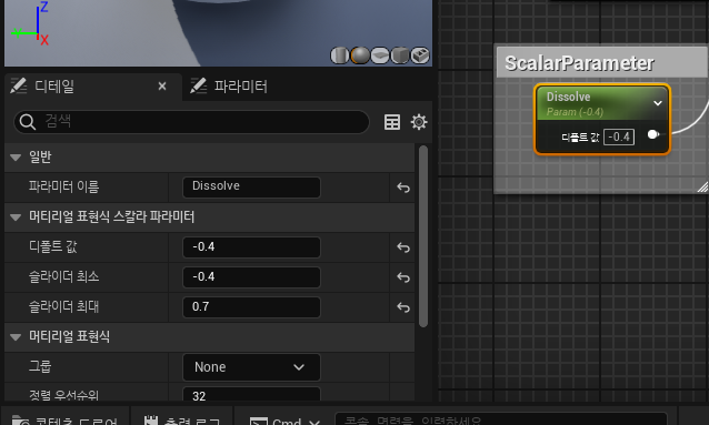 2.ScalarParameter 노드를 꺼내 이름을 Dissolve로 설정하고 해당 그림과 같이 연결합니다