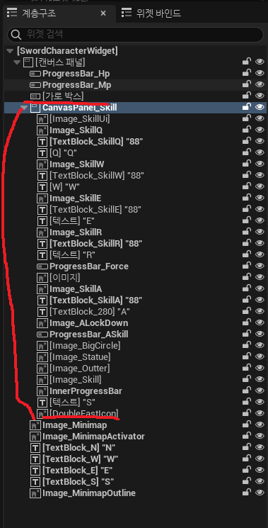 위젯에서는 반드시 해당 캔버스패널과 BindWidget이 되어있어야하며 이름이 동일해야합니다