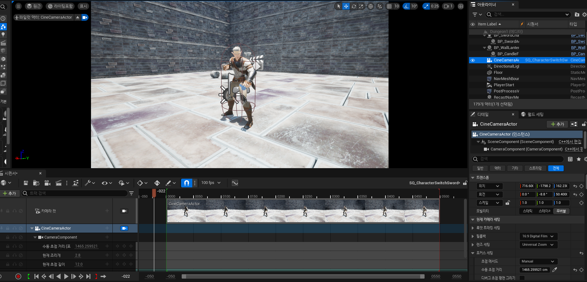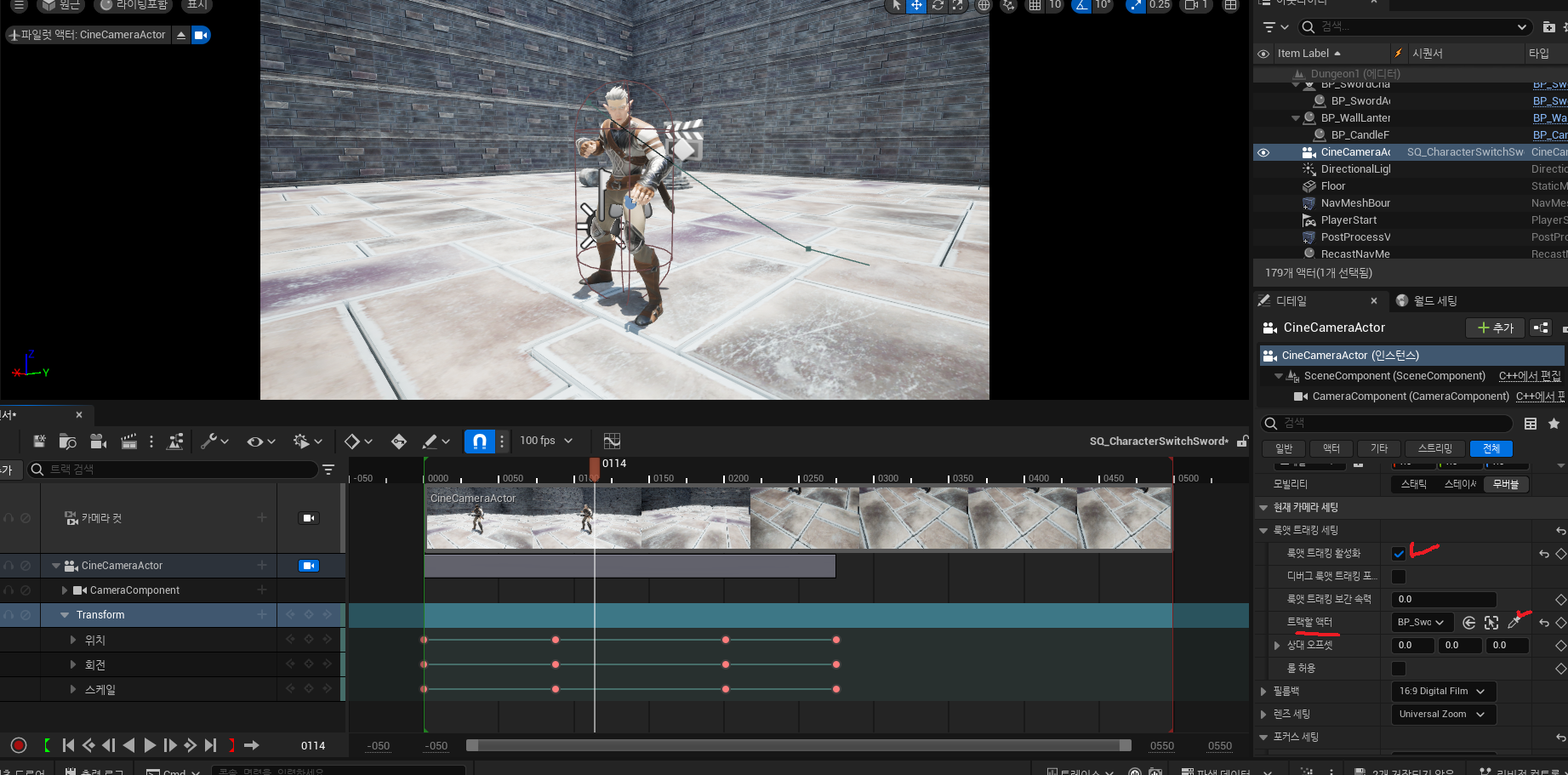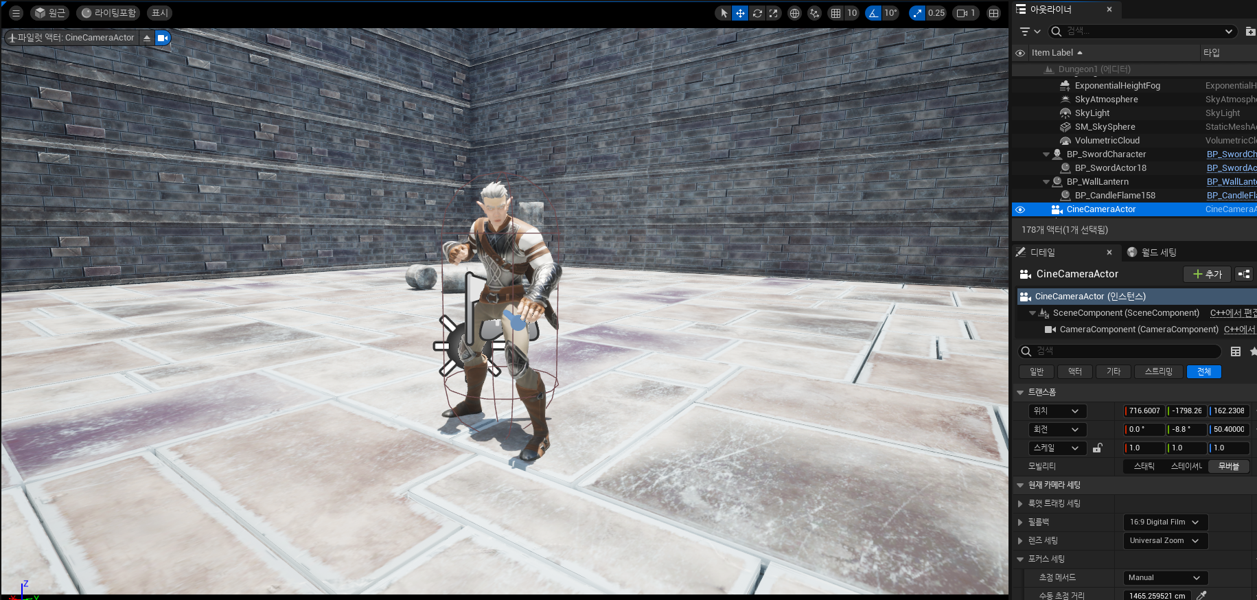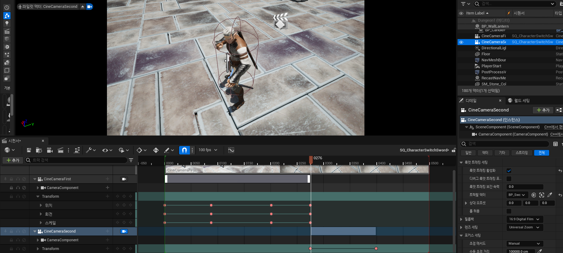 첫 던전을 입장할때 캐릭터 옆부터 앞을 비추다가 다시 원래시점으로 돌아가는 연출을 내고싶었습니다