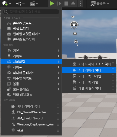 원하는 위치에 시네카메라를 만든뒤 배치합니다