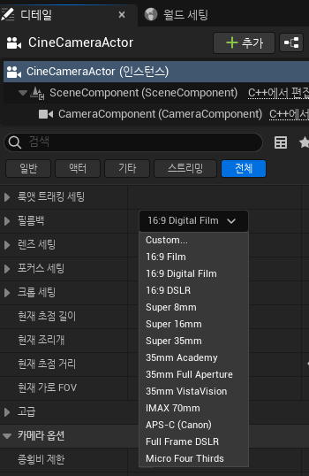 필름백에서 카메라의 종류를 선택할수있습니다