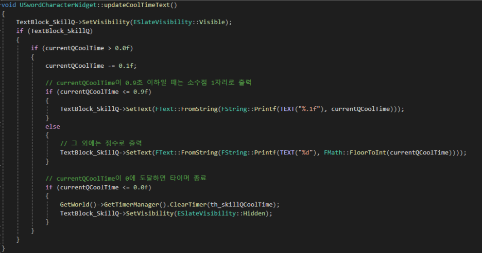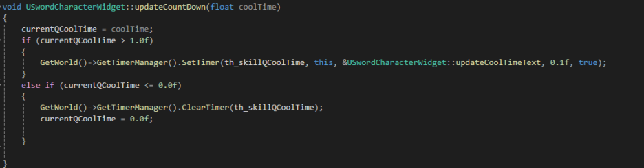 coolTime변수값을 인자로 받아 0.1초마다 text를 업데이트해주는 타이머를 추가해줬다