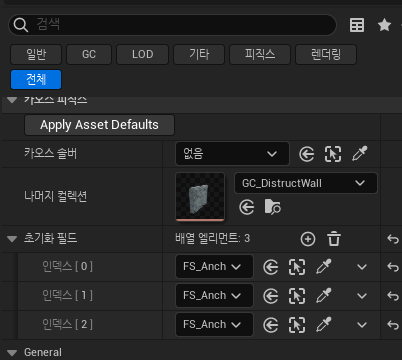 Chaos Distruction으로 만든 벽 블루프린트를 설치하고 앵커필드를 설치해줍니다