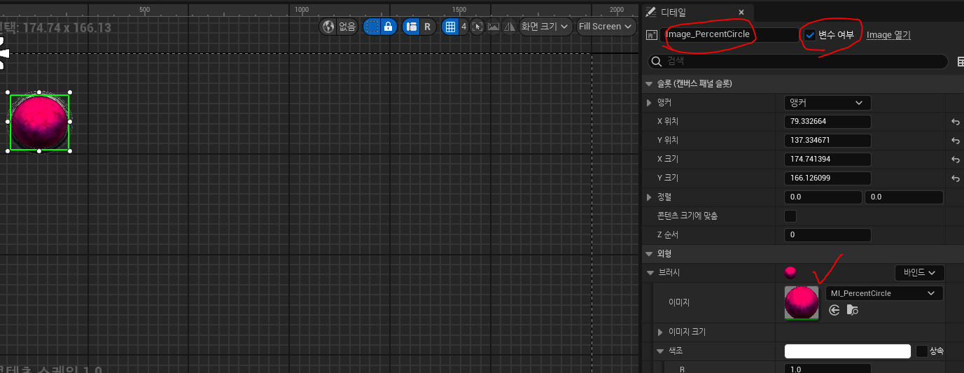 총 처치된 ai수 카운트퍼센트에 따라 좌측상단에있는 메테리얼의 ScalarParameter값이 변경되어 fill값이 변경됩니다