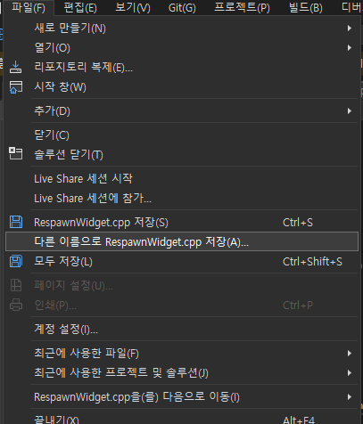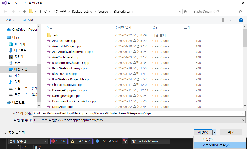 VisualStudio에서 한글을 사용하고있는 cpp파일에서 다른이름으로 저장을 합니다