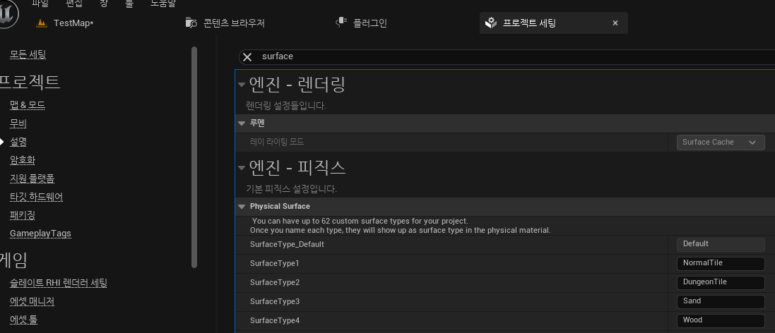 프로젝트세팅의 Physics에 사용할 surface type을 지정해줍니다